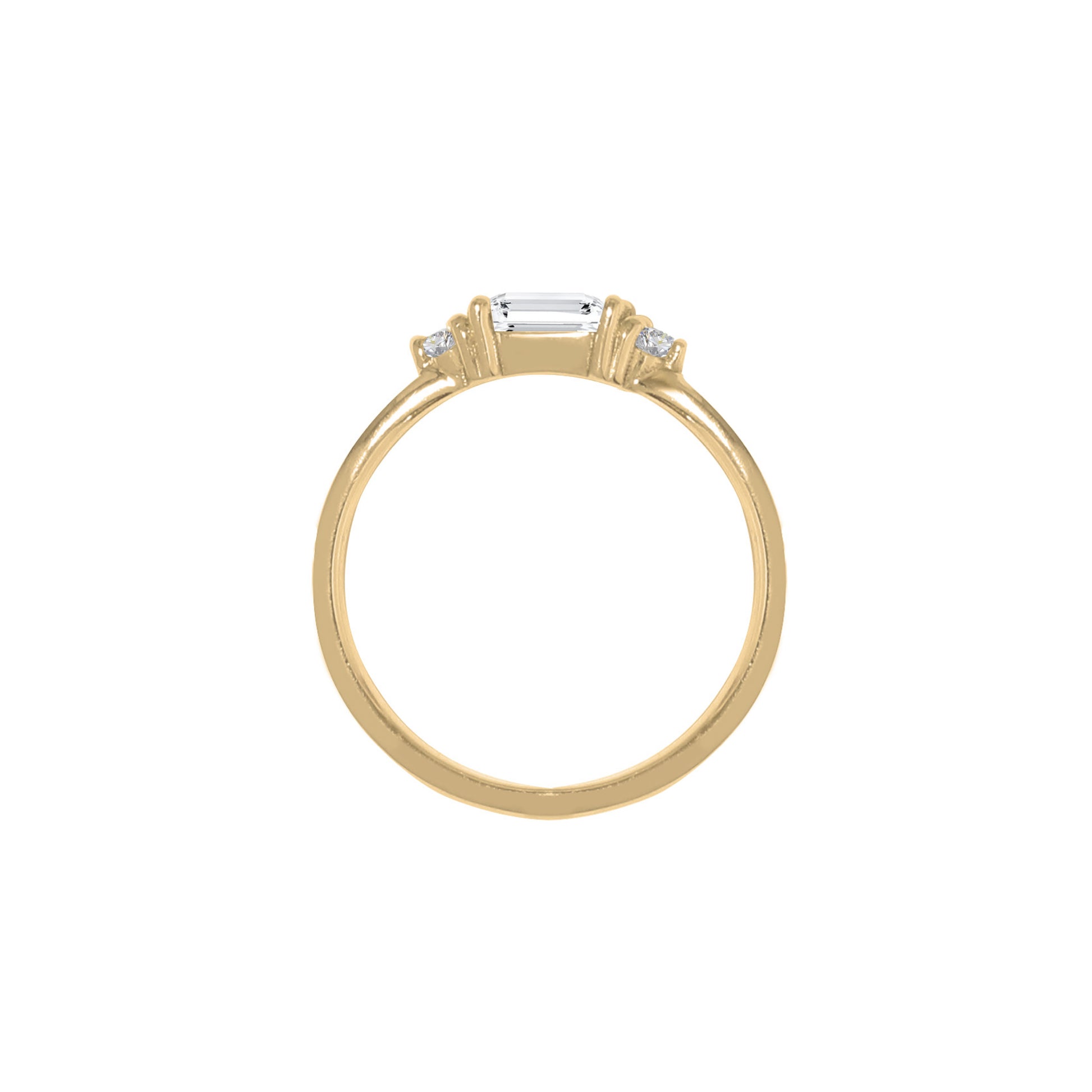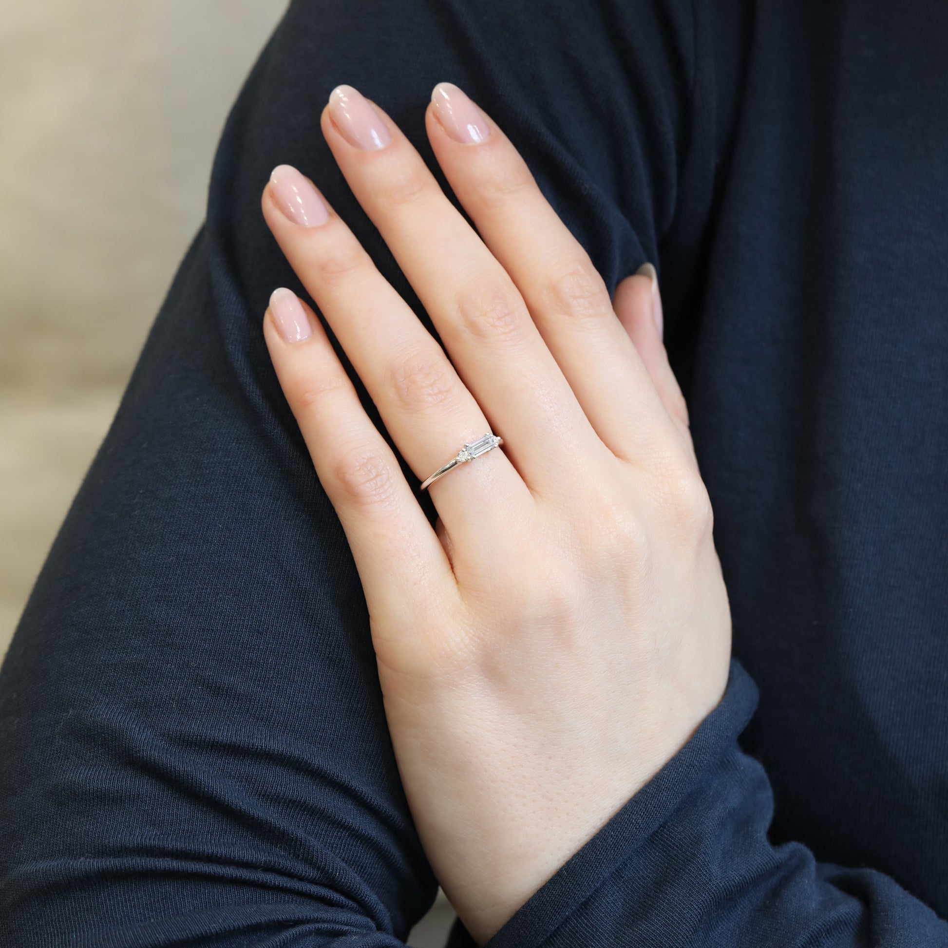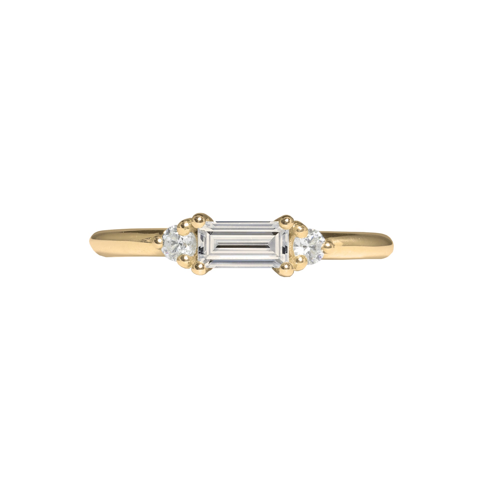 The Primrose ring: A timeless symbol of commitment, designed to be treasured forever. Handmade in London, it features a delicate arrangement of baguette and round diamonds set in recycled gold. Elegant and understated, it radiates sophistication, embodying the promise of everlasting love.