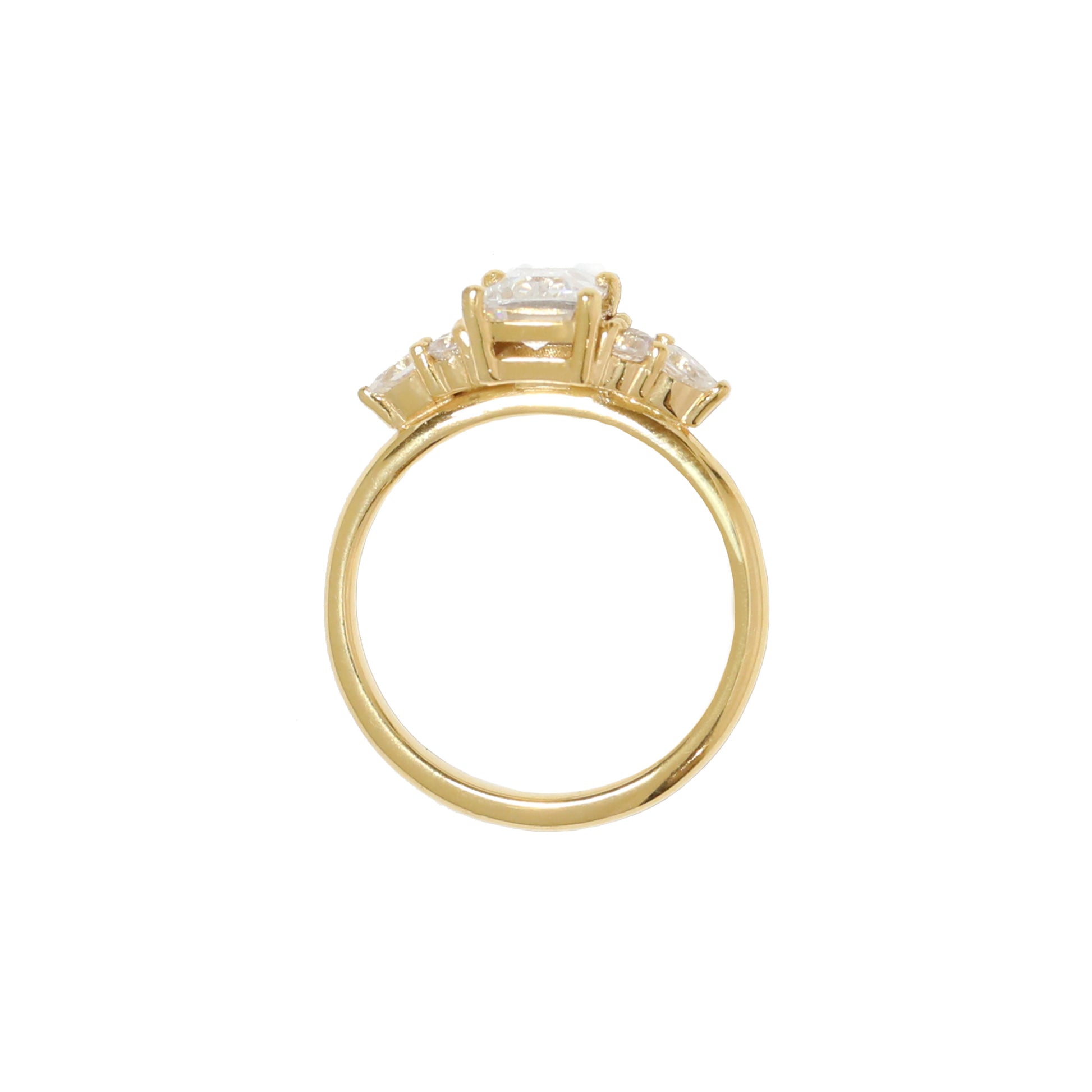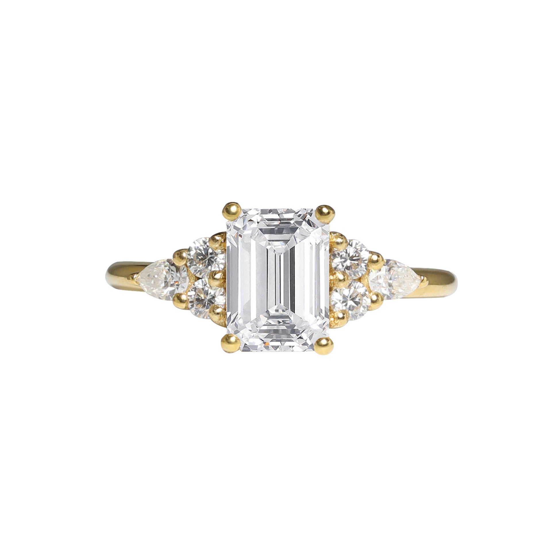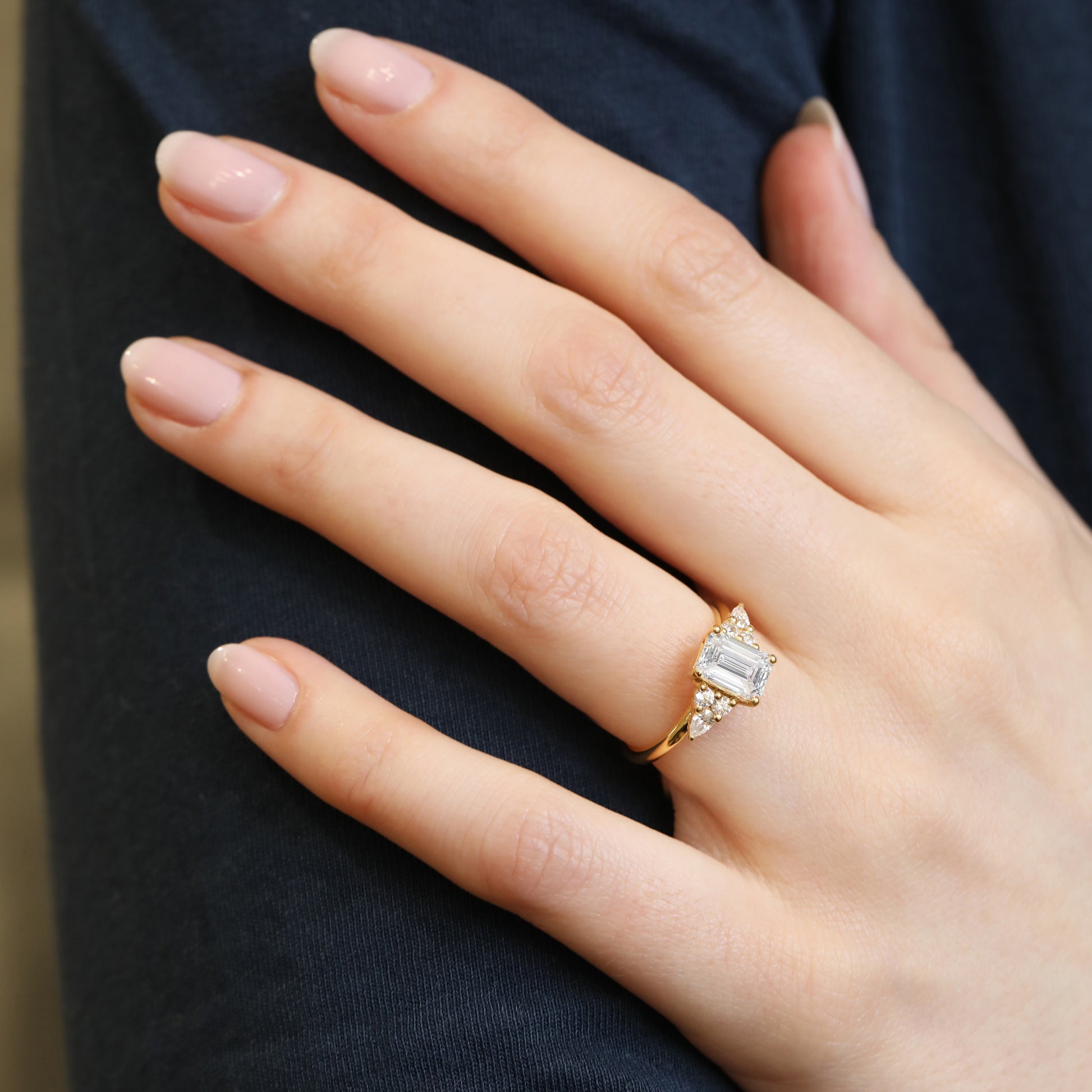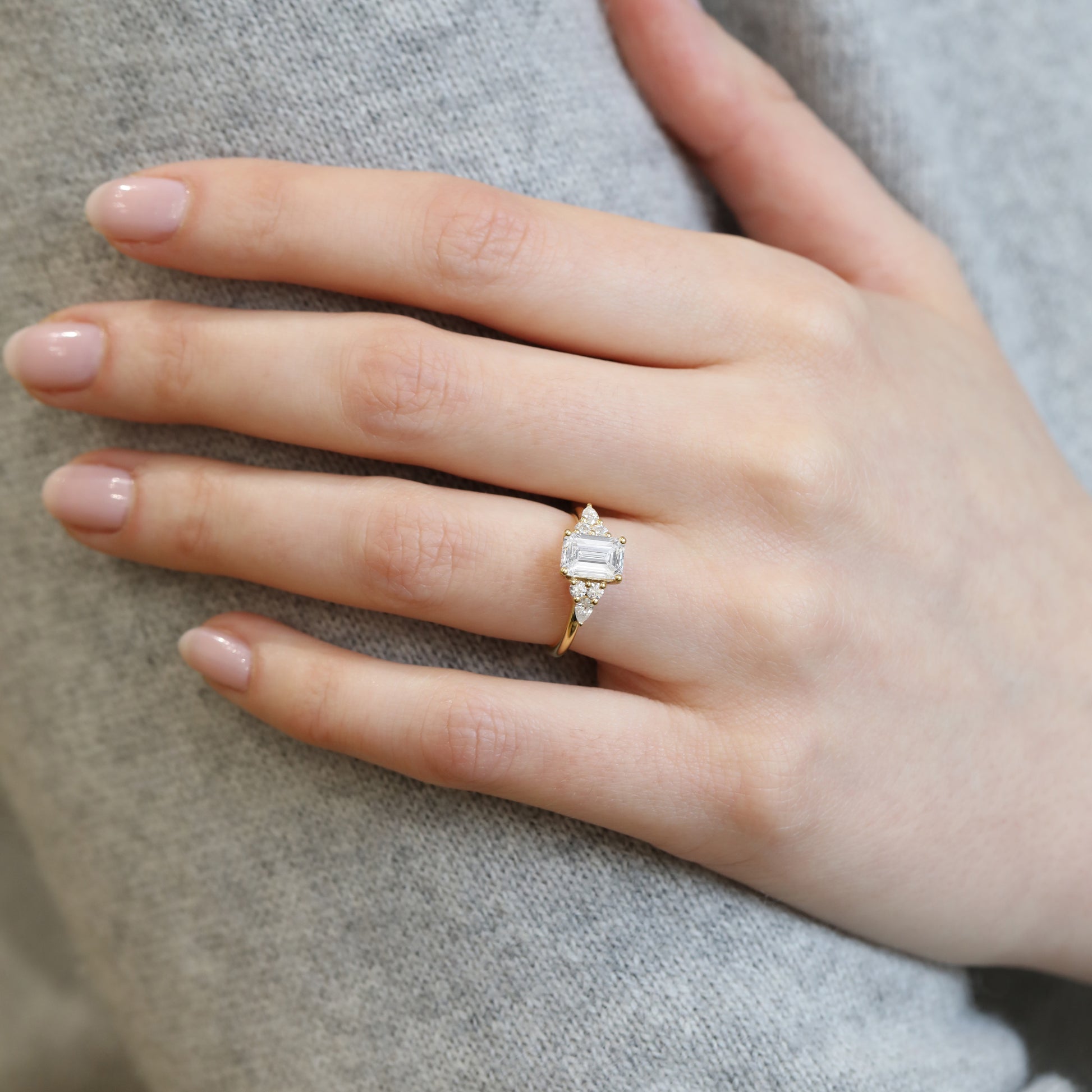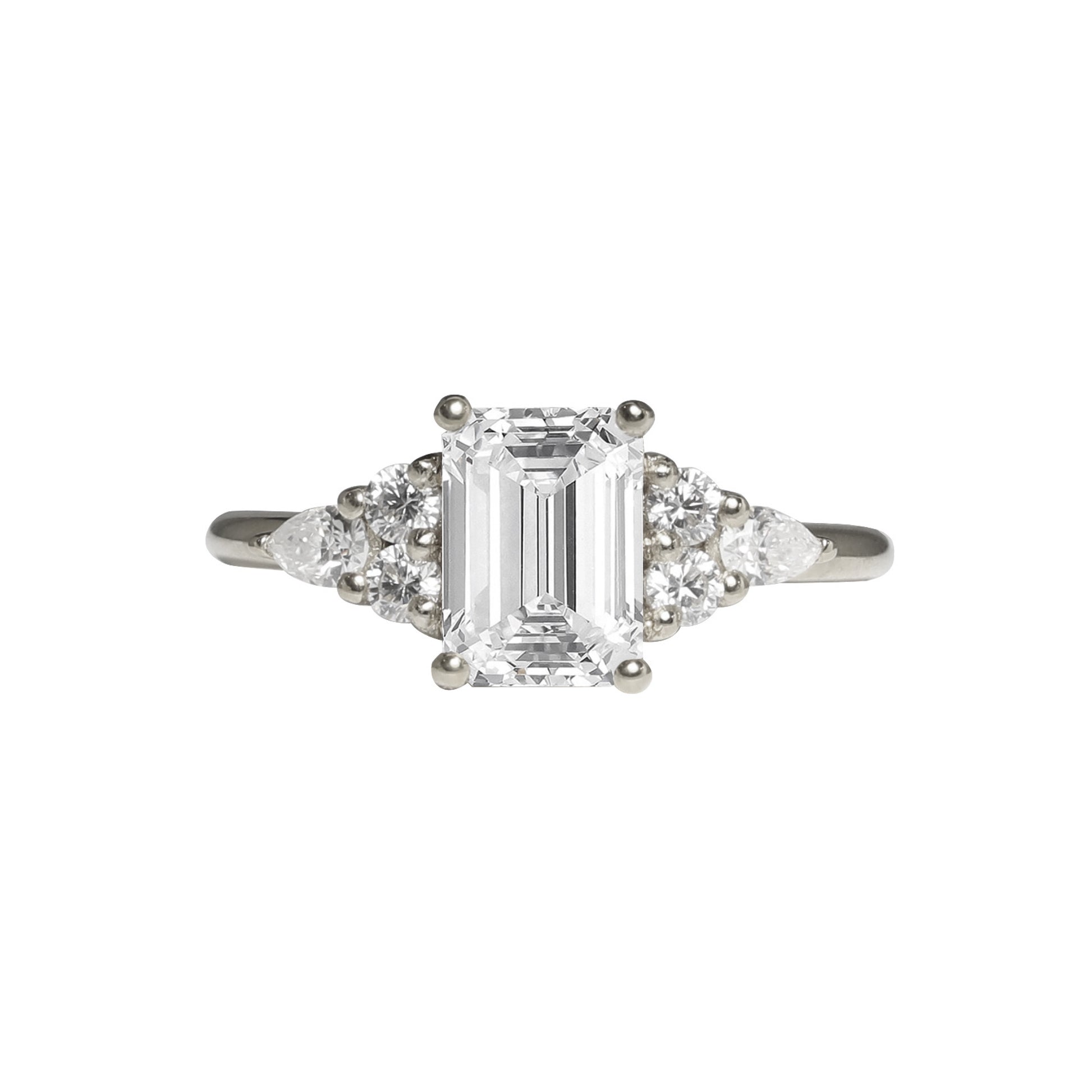This Antique inspired ring features an emerald cut diamond accented by smaller white diamond side stones. Celebrate your love with a beautiful ring, destined to become a cherished heirloom for generations to come.