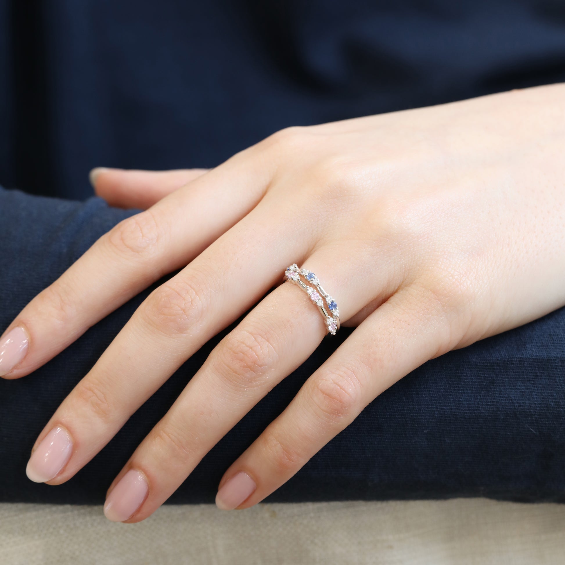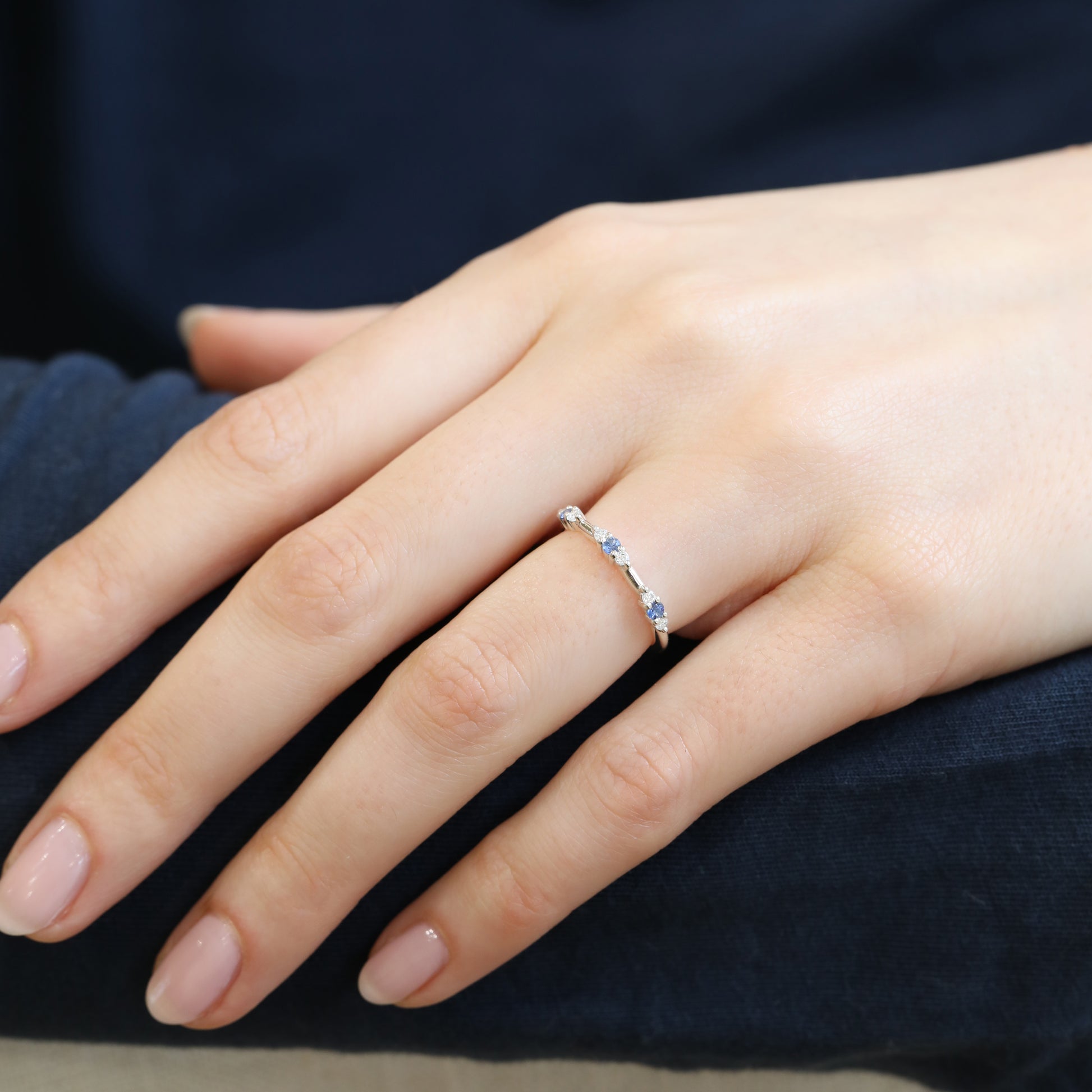 The Diamond Trio Ring collides with beautiful sapphires. Designed to be worn and cherished everyday. This delicate trio of diamonds and sapphires look amazing when worn solo or stacked. Personalise your rings with sapphires of your choice.